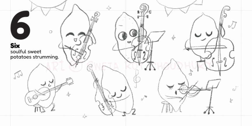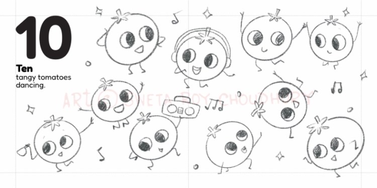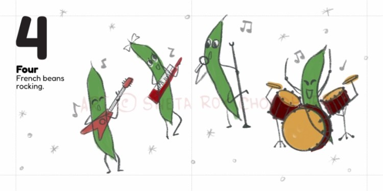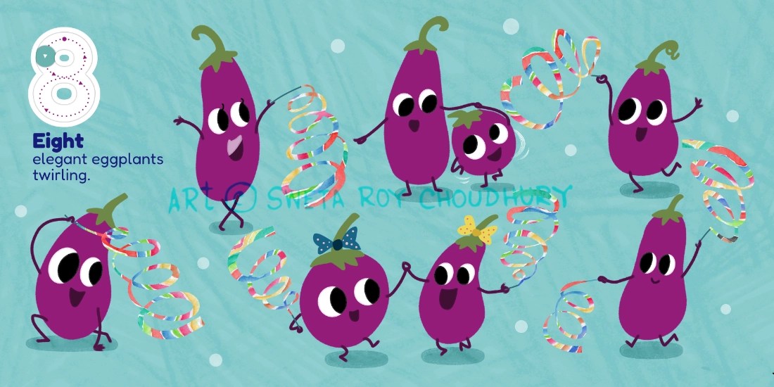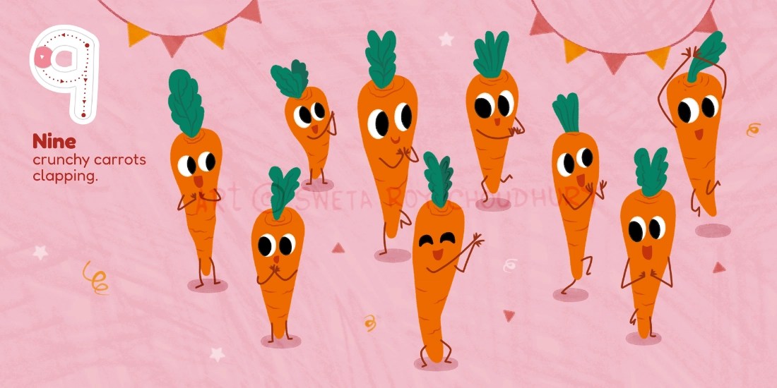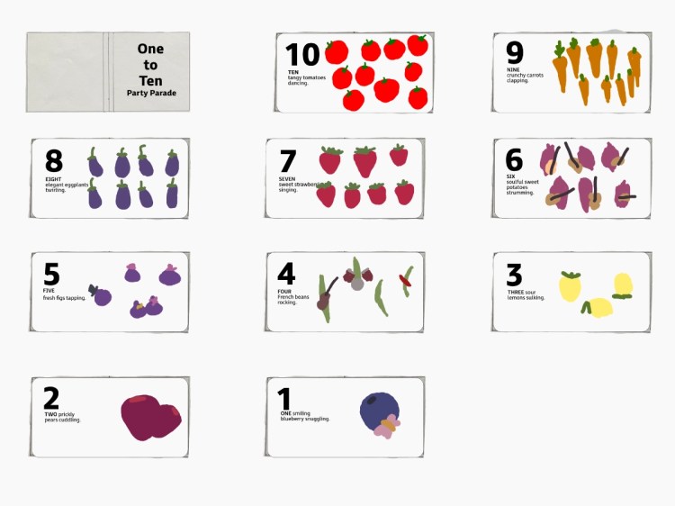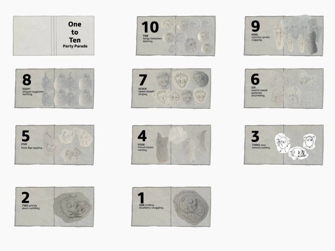 A playful counting book concept for early learners featuring dancing vegetable characters. Developed as part of a MATS class assignment, based on a text by Zoe Tucker.