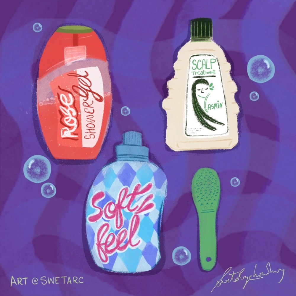 Ever wondered what your bathroom essentials do when no one’s watching? In this illustration, everyday items like shampoo bottles, soap, and a foot file come to life with quirky expressions and playful personalities, turning a simple bathroom into a lively little world full of character and charm.